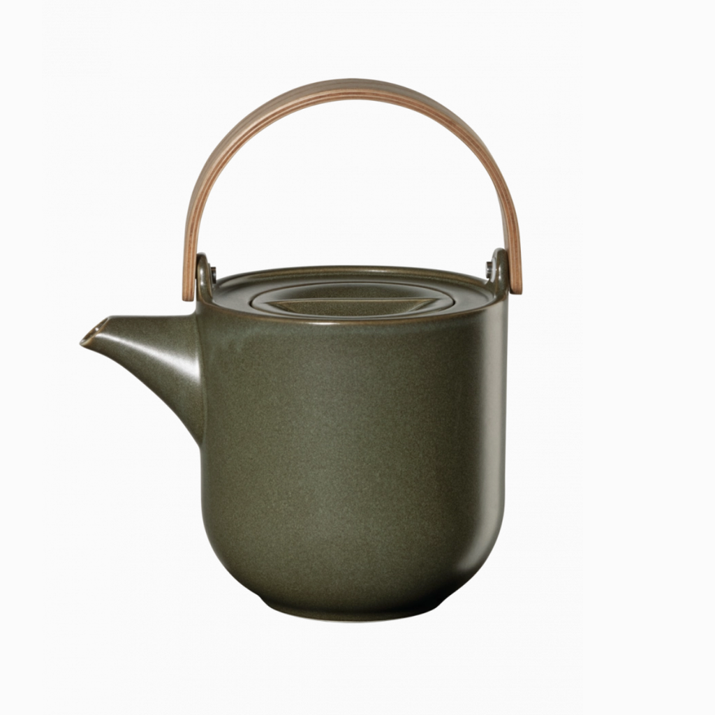 A gorgeous glazed porcelain teapot with a deep well and a lovely wooden handle.